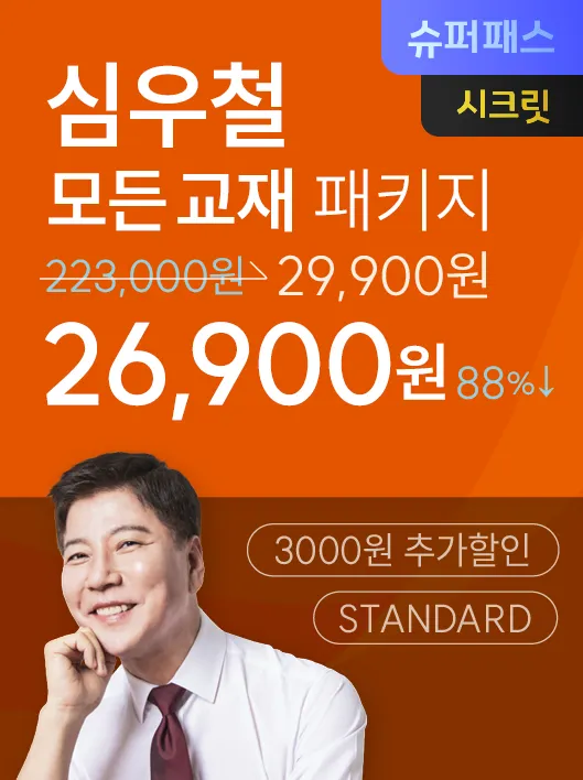 영어 | 심우철 | [슈퍼패스] 심우철 모든 교재 패키지 STANDARD | 18종+ | 223,000원 | 29,900원 | 26,900원 |