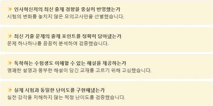 한 줄 한 줄 정성스레 모아 보석 같은 모의고사를 찾아 나섰고, 합격으로 향하는 노하우를 가득 담아냈습니다.
